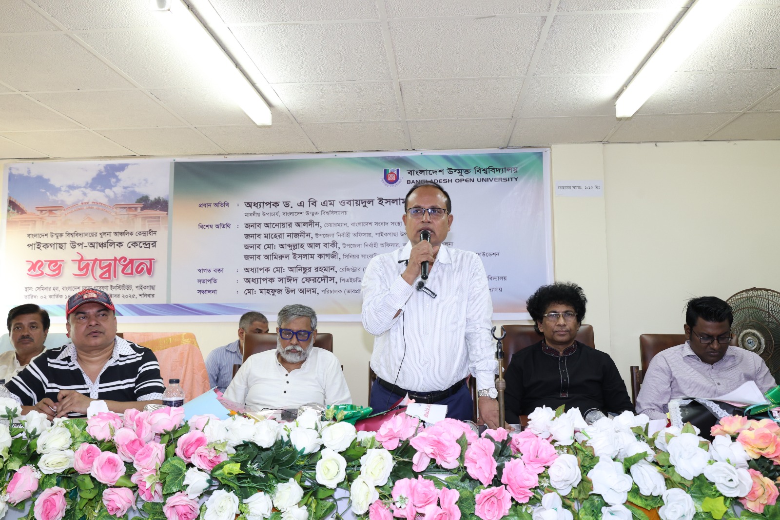 অনুষ্ঠানে প্রধান অতিথি হিসেবে উপস্থিত থেকে উদ্বোধন ঘোষণা করেন, বাউবির মাননীয় উপাচার্য অধ্যাপক ড. এ বি এম ওবায়দুল ইসলাম। তিনি বলেন—“বাংলাদেশ উন্মুক্ত বিশ্ববিদ্যালয় দেশের প্রত্যন্ত অঞ্চলের মানুষের দোরগোড়ায় শিক্ষা পৌঁছে দিতে নিরলসভাবে কাজ করছে।পাইকগাছা উপ-আঞ্চলিক কেন্দ্রের উদ্বোধনের মধ্য দিয়ে আরও একটি নতুন অধ্যায় সূচিত হলো। এটি উপকূলীয় অঞ্চলের শিক্ষার্থীদের জন্য উচ্চশিক্ষা অর্জনের নতুন দুয়ার খুলে দেবে"। বাংলাদেশ উন্মুক্ত বিশ্ববিদ্যালয়ের উপাচার্য তাঁর বক্তব্যে আরো বলেন, " তিনি রাজনীতিক হিসেবে নয়, একজন শিক্ষক হিসেবে শিক্ষকদের মাঝে এসেছেন। বিশ্ববিদ্যালয়টি ১৯৯২ সালের ২১ অক্টোবর প্রতিষ্ঠিত হয়ে ৩৩ বছরে পদার্পণ করতে যাচ্ছে। এর মূল লক্ষ্য হলো প্রান্তিক ও অবহেলিত জনগোষ্ঠীর মাঝে দূরশিক্ষণ পদ্ধতির মাধ্যমে শিক্ষা বিস্তার করা, যাতে বয়স বা পেশা কোনো বাধা না হয়। তিনি উদাহরণ দেন ৭৫ বছর বয়সে বিএ পাস করা সাদেক আলী প্রামানিক নামে এক শিক্ষার্থীর কথা, যা প্রমাণ করে যে শিক্ষা আজ জীবনব্যাপী। উপাচার্য জোর দিয়ে বলেন, “উন্মুক্ত মানে নকল নয়, বরং মানসম্পন্ন শিক্ষা ঘরে ঘরে পৌঁছে দেওয়া।” এছাড়াও বিশ্ববিদ্যালয় এখন বিএ, এমএ ছাড়াও কৃষি, মৎস্য, পোলট্রি, আইটি ও বিভিন্ন কারিগরি বিষয়ে সার্টিফিকেট ও ডিপ্লোমা কোর্স চালু করেছে, যাতে শিক্ষার্থীরা শুধু চাকরির জন্য নয়, উদ্যোক্তা হিসেবেও গড়ে উঠতে পারেন। তিনি জানান, বিশ্ববিদ্যালয় সারা দেশে ১২টি আঞ্চলিক ও ৮০টি উপ-আঞ্চলিক কেন্দ্র রয়েছে। পাইকগাছা ও কয়রা এলাকার মানুষের জন্য এ উপ-আঞ্চলিক কেন্দ্রটির আজ আনুষ্ঠানিক যাত্রা শুরু হলো, যাতে উপকূলীয় জনগণ ঘরে বসেই শিক্ষার সুযোগ পায়। বক্তব্যের শেষাংশে তিনি জানান, বিশ্ববিদ্যালয়ের সব আর্থিক লেনদেন এখন অনলাইনে হচ্ছে, সেশন জ্যাম প্রায় শেষ, সার্টিফিকেট ও আইডি কার্ড প্রাপ্তি সহজ হয়েছে। উপাচার্য শিক্ষার মান রক্ষা, নকল প্রতিরোধ ও দক্ষ মানবসম্পদ গঠনের মাধ্যমে একটি সুন্দর, শিক্ষিত ও কর্মক্ষম নতুন বাংলাদেশ গড়ার অঙ্গীকার ব্যক্ত করেন।