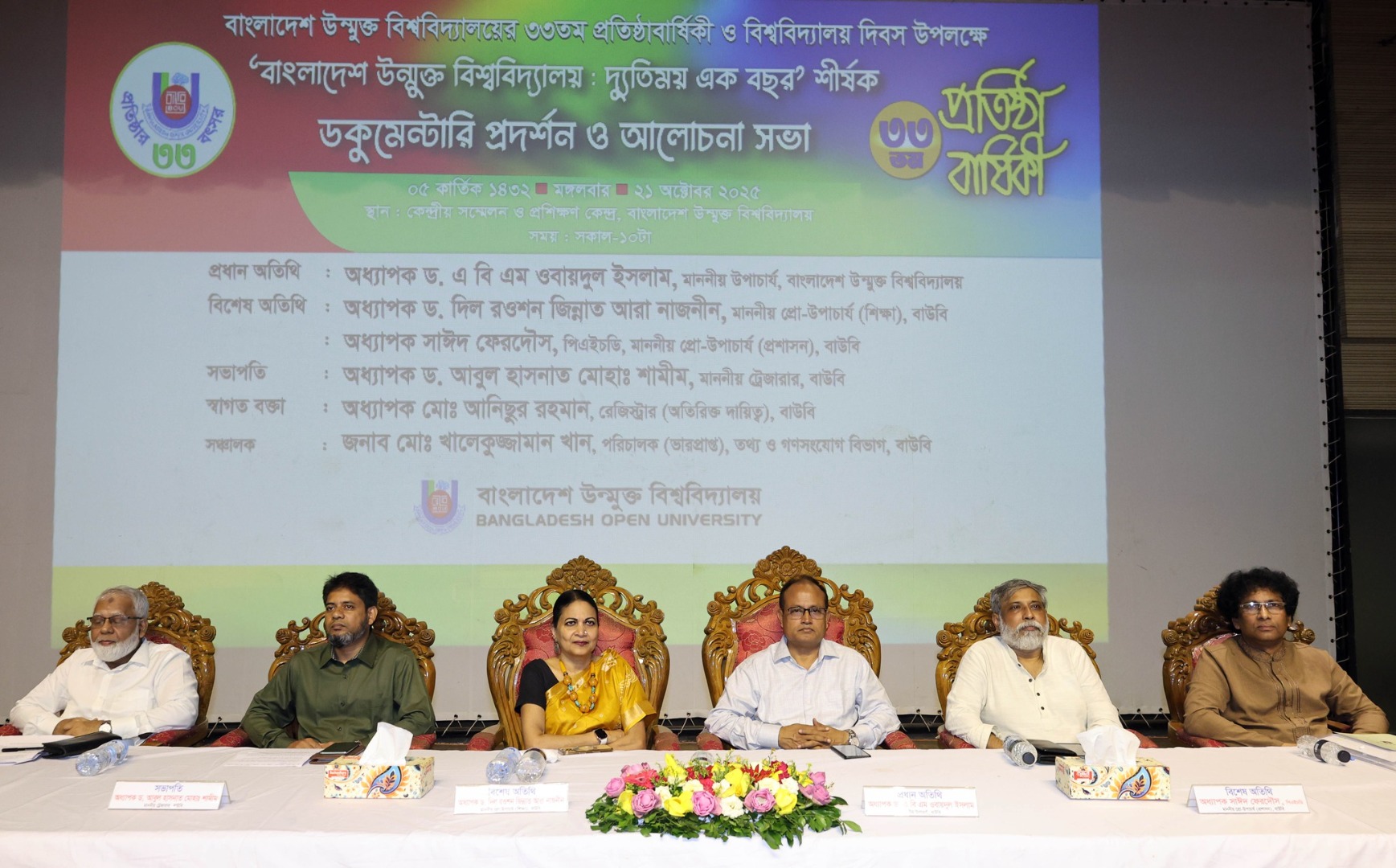 এরপর কেন্দ্রীয় সম্মেলন কেন্দ্রে অনুষ্ঠিত হয় ‘বাংলাদেশ উন্মুক্ত বিশ্ববিদ্যালয়: দ্যুতিময় এক বছর’ শীর্ষক প্রামাণ্যচিত্র প্রদর্শন ও আলোচনা সভা। অনুষ্ঠানের প্রধান অতিথি ছিলেন বিশ্ববিদ্যালয়ের উপাচার্য অধ্যাপক ড. এ বি এম ওবায়দুল ইসলাম। উপাচার্য তাঁর বক্তব্যে বিশ্ববিদ্যালয়ের প্রতিষ্ঠাতা অধ্যাপক ড. এম. শমসের আলী ও তৎকালীন প্রধানমন্ত্রী বেগম খালেদা জিয়ার অবদান শ্রদ্ধাভরে স্মরণ করে বলেন, “বাউবি প্রতিষ্ঠার মূল লক্ষ্য হলো অবহেলিত ও কর্মজীবী জনগোষ্ঠীর মধ্যে শিক্ষার আলো ছড়িয়ে দেওয়া। এখন আমরা সেই লক্ষ্য পূরণের পথে আরও দৃঢ়ভাবে এগিয়ে যাচ্ছি।” তিনি বলেন, “বিশ্ববিদ্যালয় কেবল সার্টিফিকেট বিতরণের কেন্দ্র নয়, এটি জ্ঞান ও দক্ষ মানবসম্পদ তৈরির প্রতিষ্ঠান।” তিনি আরও জানান, সেশনজট নিরসন, নকলমুক্ত পরীক্ষার পরিবেশ, ফলাফল ও নাম সংশোধন প্রক্রিয়ার গতি বৃদ্ধি এবং প্রশাসনিক কাঠামোয় গতিশীলতা আনতে উল্লেখযোগ্য অগ্রগতি হয়েছে। পাশাপাশি শিক্ষার্থীদের কর্মসংস্থানযোগ্য করে তুলতে নতুন দক্ষতাভিত্তিক প্রোগ্রাম চালুর উদ্যোগ নেওয়া হয়েছে।